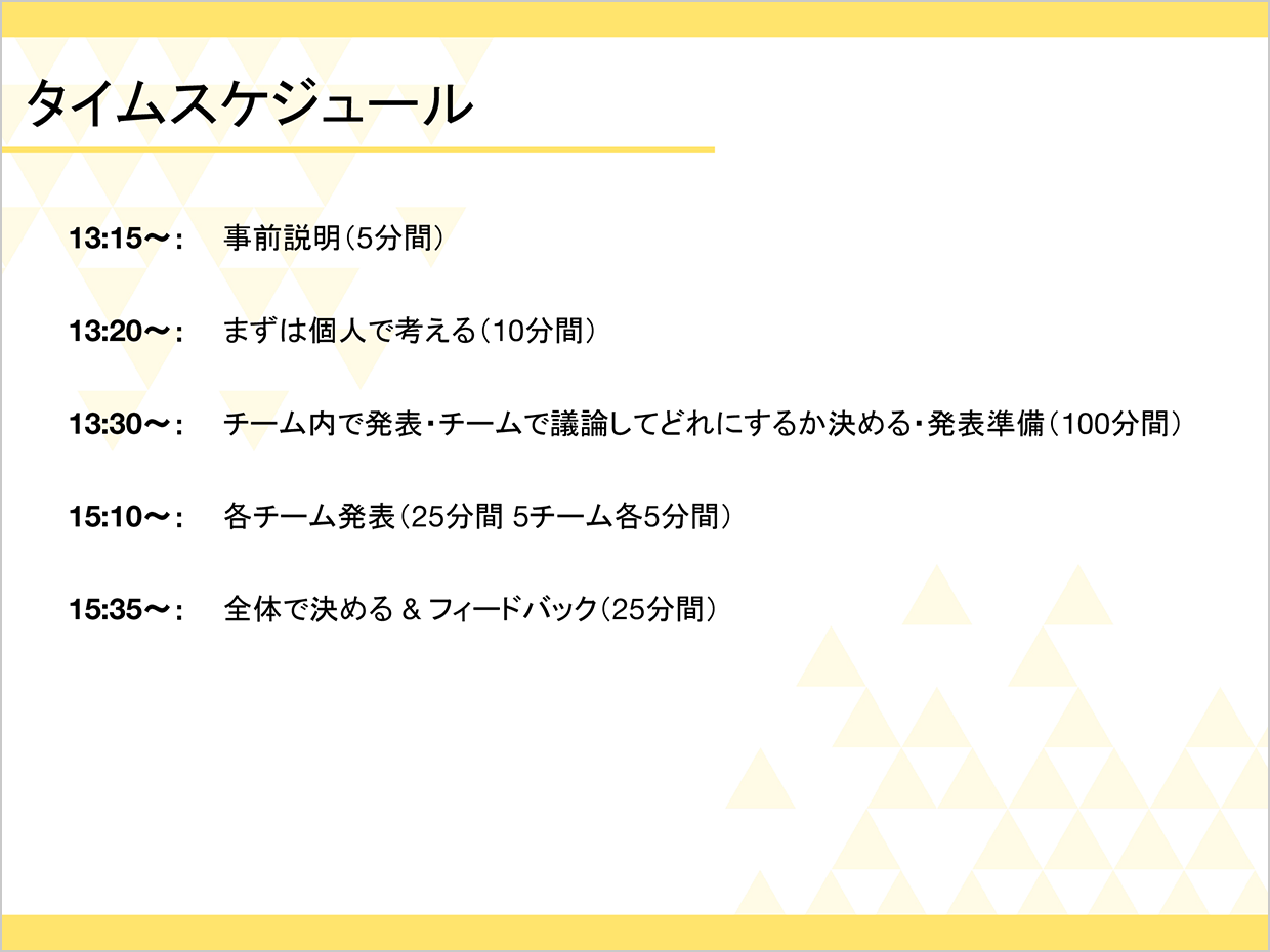 実施方法は4~5人のチームになって制限時間内にアイデア出し、企画書作成、各チーム5分間の持ち時間で発表を行います。 資料に落とし込む内容が多いので、100分という時間制限の中で慌ただしく、分担、協力し合いながら資料を作り上げていきます。業務で関わらないメンバーをなるべく組み合わせたチームでやっていきます。