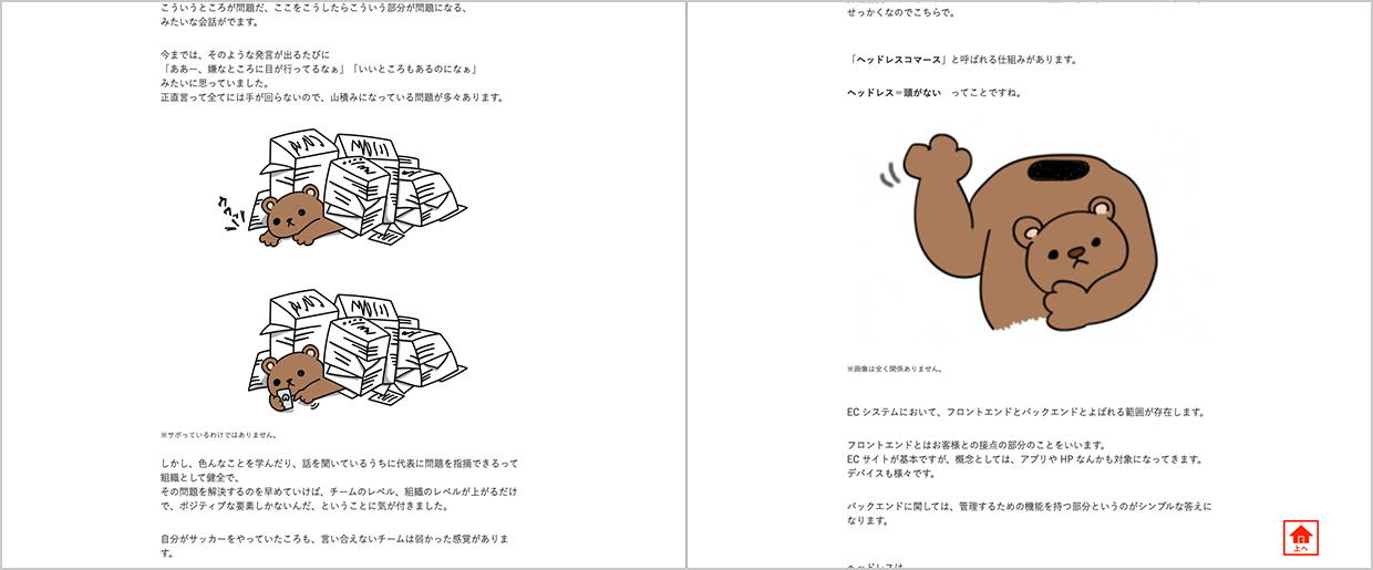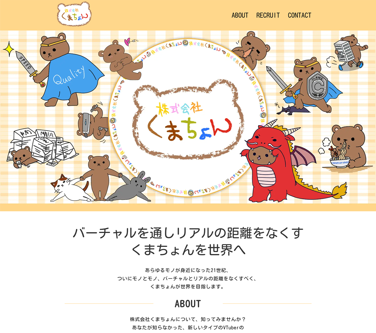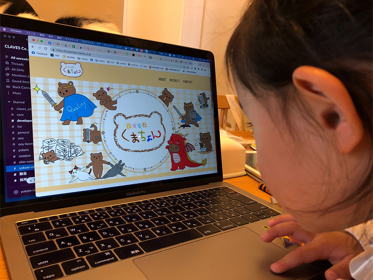 株式会社くまちょん公式ホームページ制作のディレクションを担当しました。 入社したばかりで不明な点も多く、CLAVESの先輩ディレクターである田中さんにもたくさんお手伝い頂き、とても助かりました。 どうやってすすめたらいいかな…と私が考えている間に、エンジニアさんたちがバリバリと進めてくださり、手を動かしてからのスピード感にはとても驚きました。皆とてもかっこよかったです! また、今まで描いたくまちょんをいっぱい使いましょう!と言っていたにも関わらず、くまちょんの新規カットもたくさん描いて頂き、可愛いくまちょんをいっぱい見れて個人的にはとてもほくほくしています。 くまちょんの動画を見た時の、皆で、ワッ…!と湧いた瞬間はとても印象深かったです。 私も、その日は作成された1分程度の動画を何度も何度もリピート視聴して癒やされていました。 今回作成頂いたロゴや、Face bookに利用した背景などは社内でも評判がよかったので、ぜひマスキングテープにして利用したいと目論んでいます。 また、今回、クラベスに新たなスキルが追加されたので、今後も定期的にくまちょんを動かしたいなぁ……という野望もあります。 うまく調整できなかった部分等、ディレクターとして反省点はありますが、CLAVES入社後初リリースの案件としてとても楽しかったです。