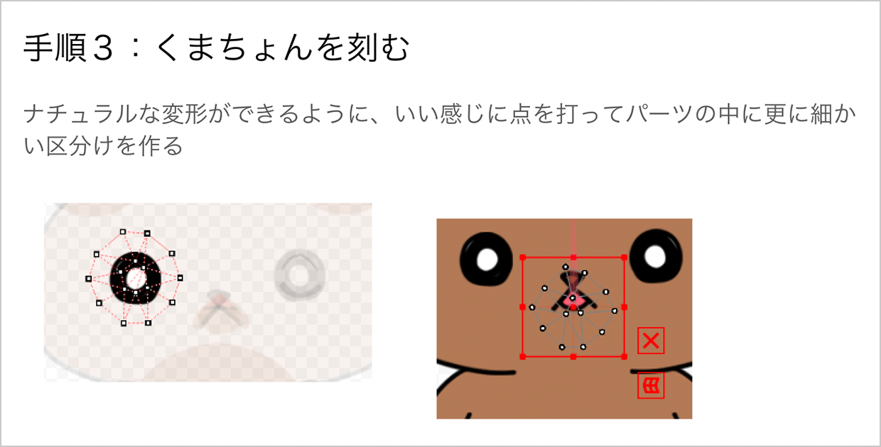 動くくまちょんの実装を担当しました! 素材はもうデザイナーさんにお任せするしかなかったので、こういうのを用意して欲しいと参考になりそうな動画を渡して頼り切ってしまいました。しかし、求めていたもの以上の素材を用意していただいたので、うちのデザイナーさんはやっぱりすごいなと思いました。 実装については、ある程度仕組みは知っていたのでなんとかなるだろうと思っていましたが、想像よりも何倍も大変でした。くまちょん自体はシンプルなパーツ構成でしたが、フルオートでアニメーションに変換できるわけではないので、それを自然に見せる作業が大変でした。例えば瞬き一つとっても、パーツを自然に変形させるためのメッシュという区切りを手作業で何十個と点を打って、変形させたときに変な挙動にならないかを調整したり、瞼があるキャラクターではないので、目を押し潰して変形させたところをアニメーションの速度調整でいい塩梅にしたりと地道な作業がたくさんでした。