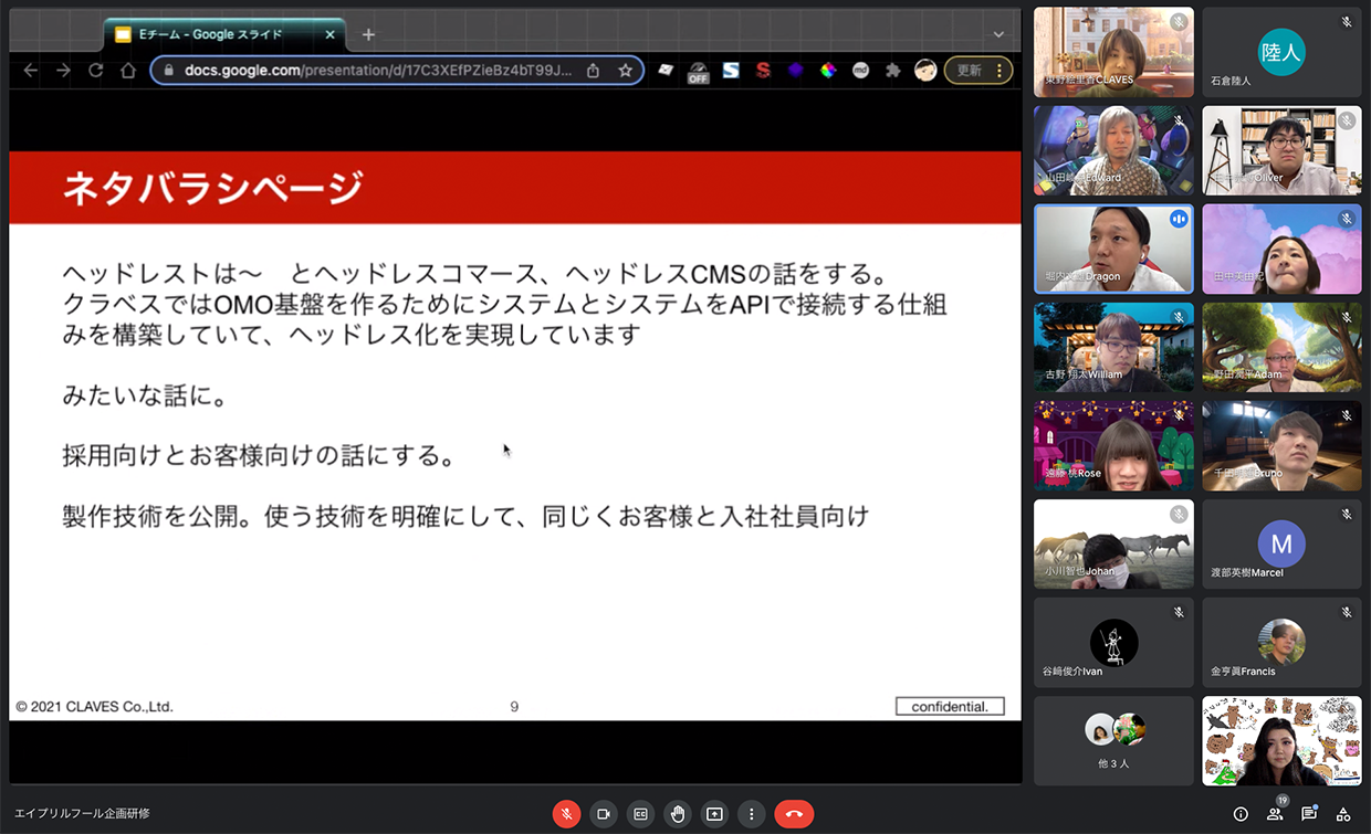 クラベスは昨年の夏からメンバーが多く増えたため、エイプリルフール企画に参加するメンバーが多く、斬新で新しいアイデアも多く楽しい発表の時間でした!