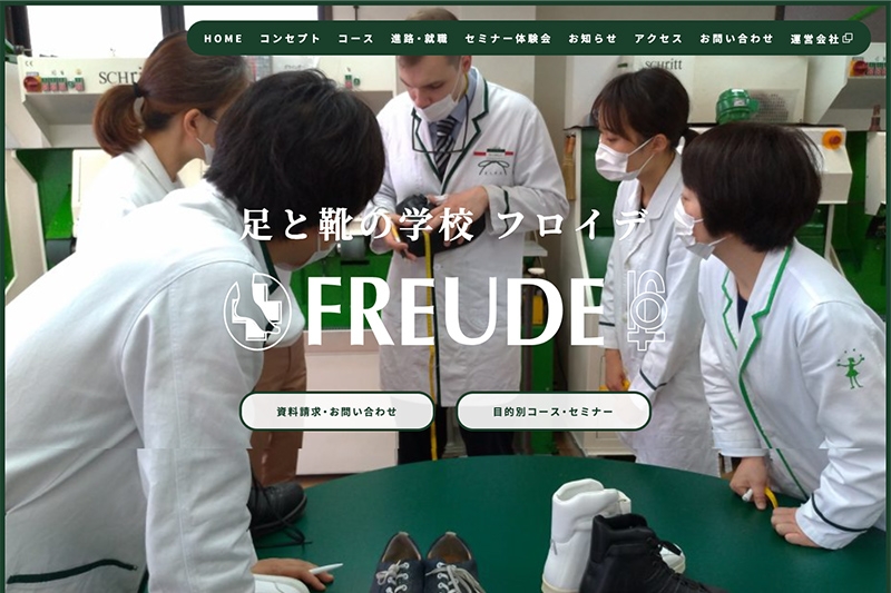 「足にトラブルがある方もない方も、全ての方に履 き心地がよい靴、歩きやすい靴をご提案できる人を育成する」というコンセプトのもと、オートペディシューマイスターの教育カリキュラムに則った靴作りのプロを育成する学校として、アルカ・グループが運営しています。 フロイデは、日本で唯一の本場ドイツの公立靴専門学校の姉妹校です。 ドイツや日本の第一線で活躍する講師陣により、本場のカリキュラムや工具を使った伝統のある技術を学ぶことができる学校です。