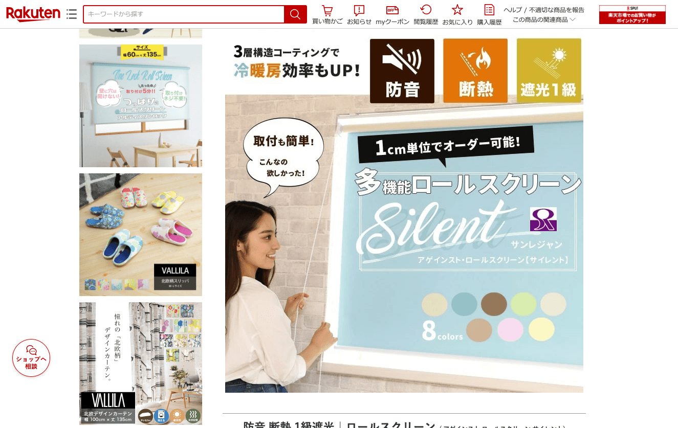 楽天市場の商品ページにおいて、オーダーカーテンの受注できる仕組みをJavaScriptでサイト内に埋め込むことで実現しました。 選択したサイズに応じた価格を表示し、その内容でカートに投入するように実現した。幅と高さの比率の条件なども加味した選択をするための制御を入れ、カートにその情報を渡すことで、発注作業までのフローで人が介在せずに実現可能にした。 オーダーカーテンのみならず、サンシェード、ブラインド、ロールスクリーンなどオーダーサイズに対応できるものを取り入れて現在も稼働中。